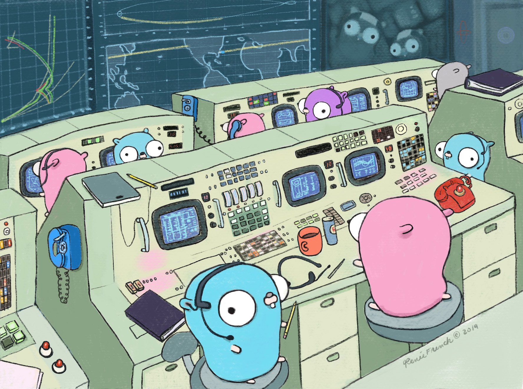 To mark the occasion, Renee French, the creator of the Go gopher, painted this delightful scene: