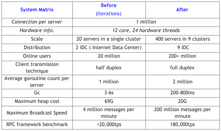 Initially, our Go-based system ran on 20 servers, with 20 million real-time connections in total. The system sent 2 million messages a day. That system now runs on 400 servers, supporting 200 million+ real-time connections. It now sends over 10 billion messages daily.