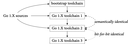 We start by building the sources for the current Go toolchain using an earlier Go version, the bootstrap toolchain (Go 1.10 used Go 1.4, written in C; Go 1.21 uses Go 1.17). That produces “toolchain1”, which we use to build everything again, producing “toolchain2”, which we use to build everything again, producing “toolchain3”.